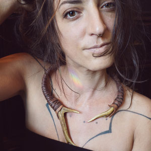 Ich kreiere Kleidung, handgebundene Bücher, Schmuck und Accessoires aus hochwertigen Stoffen und Naturmaterialien wie Knochen, Stein, Holz und recyceltem Leder.